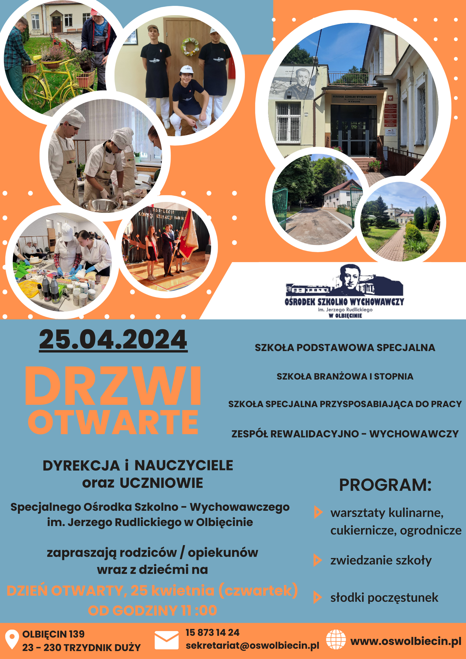 Dyrektor Specjalnego Ośrodka Szkolno - Wychowawczego im. Jerzego Rudlickiego w Olbięcinie informuje, że Dni Otwarte w Ośrodku organizowane będą 25 kwietnia od godziny 11:00.
