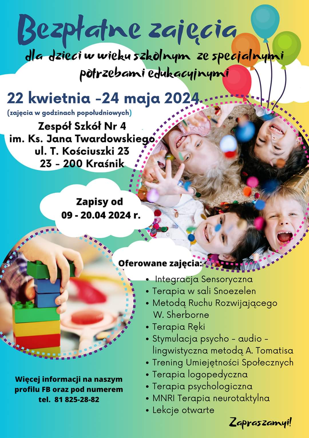 Zapraszamy również na bezpłatne zajęcia dla dzieci w wieku szkolnym ze specjalnymi potrzebami edukacyjnymi do Zespołu Szkół Specjalnych w Kraśniku (więcej informacji na plakacie w załączniku).