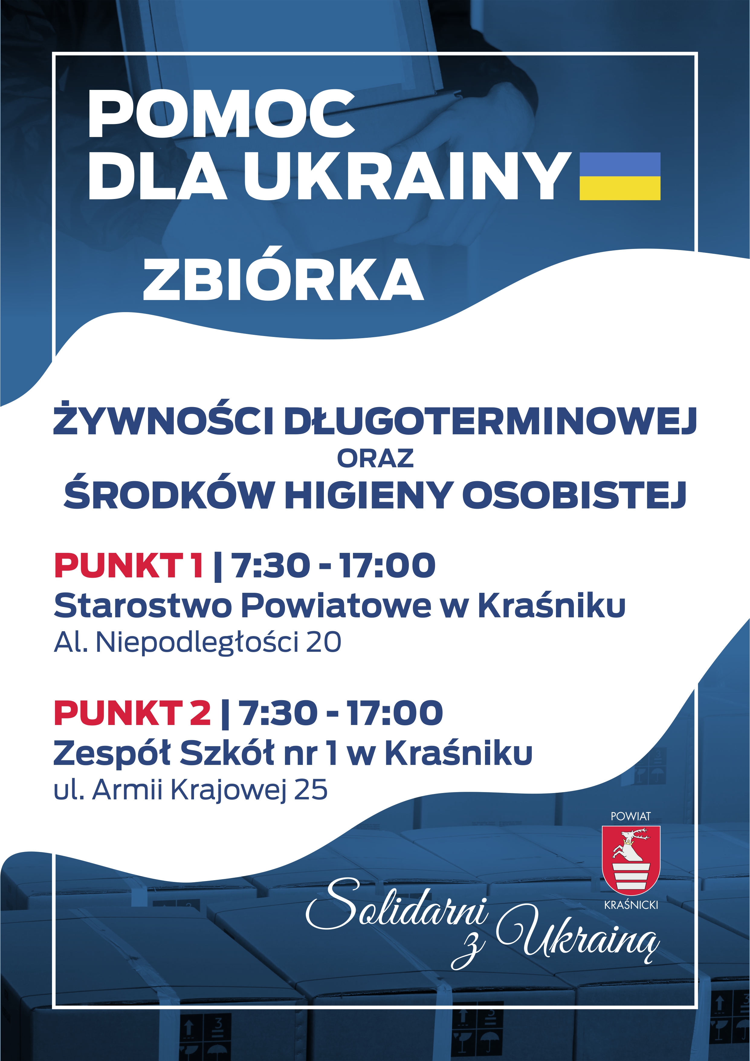Prosimy o przynoszenie do Starostwa Powiatowego w Kraśniku żywności długoterminowej i środków higieny osobistej, które w ramach współpracy ze Stowarzyszeniem Samorządów Euroregion Roztocze zostaną przekazane do mieszkańców miast partnerskich z terenów objętych wojną.