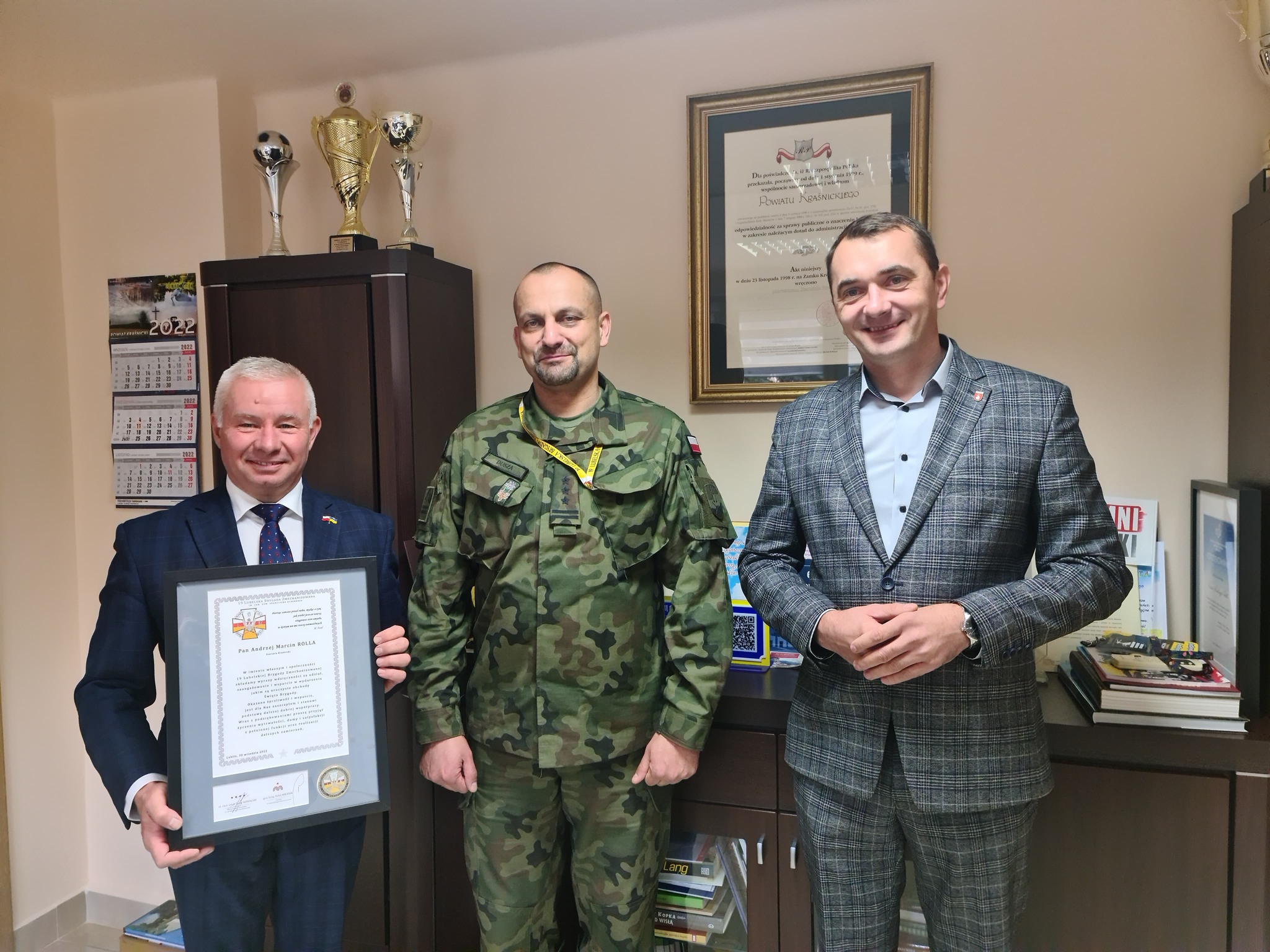 Starosta Kraśnicki Andrzej Rolla wspólnie z Wicestarostą Kraśnickim Pawłem Kudrelem spotkali się z płk Marcinem Duszą z 19. Lubelskiej Brygady Zmechanizowanej im. gen. dyw. Franciszka Kleeberga z Lublina, który przekazał symboliczne podziękowanie za wsparcie, jakiego udzielił powiat kraśnicki, podczas przypadającego na początek października święta żołnierzy z lubelskiej „dziewiętnastki”.