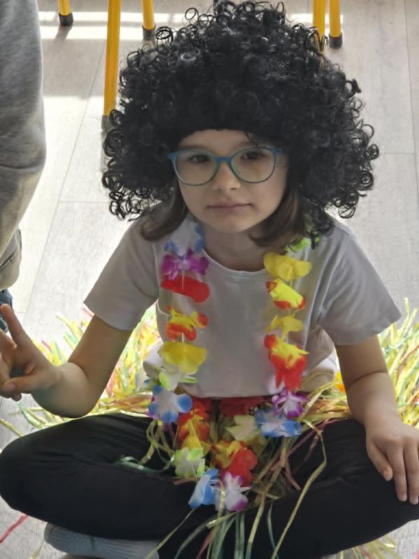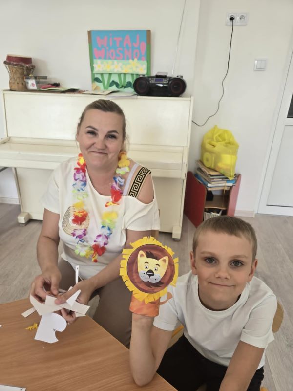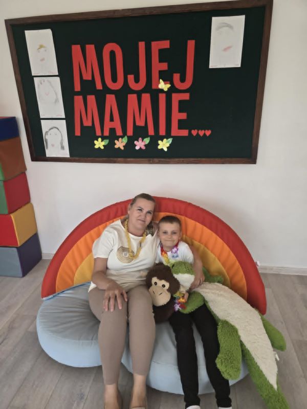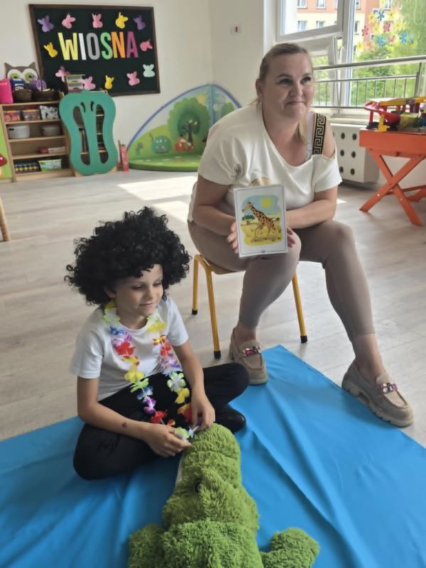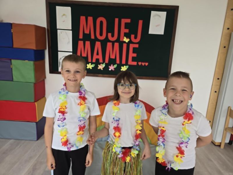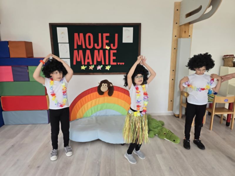 W tym roku dzień mamy w grupie ,,Rysie ‘’był egzotyczną przygodą. Nasze przedszkolaki zabrały swoje ukochane mamy w kolorową podróż do afrykańskiej dżungli .Dzieci przygotowały specjalny występ .Rysie zatańczyły afrykański taniec ubrane w czarne peruki ,kwiatowe korale i kolorowe spódniczki. Żywiołowe ruchy w tańcu ,, Pata pata’’,rytmiczne klaskanie i taneczna energia wprowadziły wszystkich w dobry nastrój .Dzieci recytowały wiersz o czarnoskórym chłopcu. Następnie przyszedł czas na piosenkę,, Dżungla’’, którą dzieci zaśpiewały z wielkim zaangażowaniem .Uśmiech na twarzy dzieci wniosła zabawa logorytmiczna,,Krokodylu nasz”. Wzruszającym momentem było zaśpiewanie piosenki ,,Kochana mamo, gdy będę duży’’ oraz gromkie ,,100 lat ‘’dla mam.. Dzieci też odgadywały kalambury prezentowane przez mamy a dotyczące zwierząt egzotycznych .Dużo radości wywołała zabawa,, 5 małych małpek ‘’,w której dzieci pokazały mamom swoje umiejętności matematyczne oraz gra na afrykańskim bębenku. Podczas zajęć plastycznych dzieci wraz z mamami wykonały lwa z grzywą z bibuły-króla zwierząt afrykańskich. Po występach przyszedł czas na poczęstunek i wspólne rozmowy. Mamy dostały od dzieci prezenty :piękne korale i laurki z serduszkami. Cała uroczystość przebiegła w radosnej atmosferze. Dzień mamy był dla naszych ,,Rysi ‘’wyjątkowym wydarzeniem, które na długo zostanie w pamięci dzieci i ich mam .Dzień mamy to wyjątkowy moment, który łączy pokolenia ,wzmacnia więzi i przypomina jak wielką wartość ma miłość Dziękujemy wszystkim mamom za obecność ,uśmiech i ciepło ,które wniosły do naszego przedszkola.