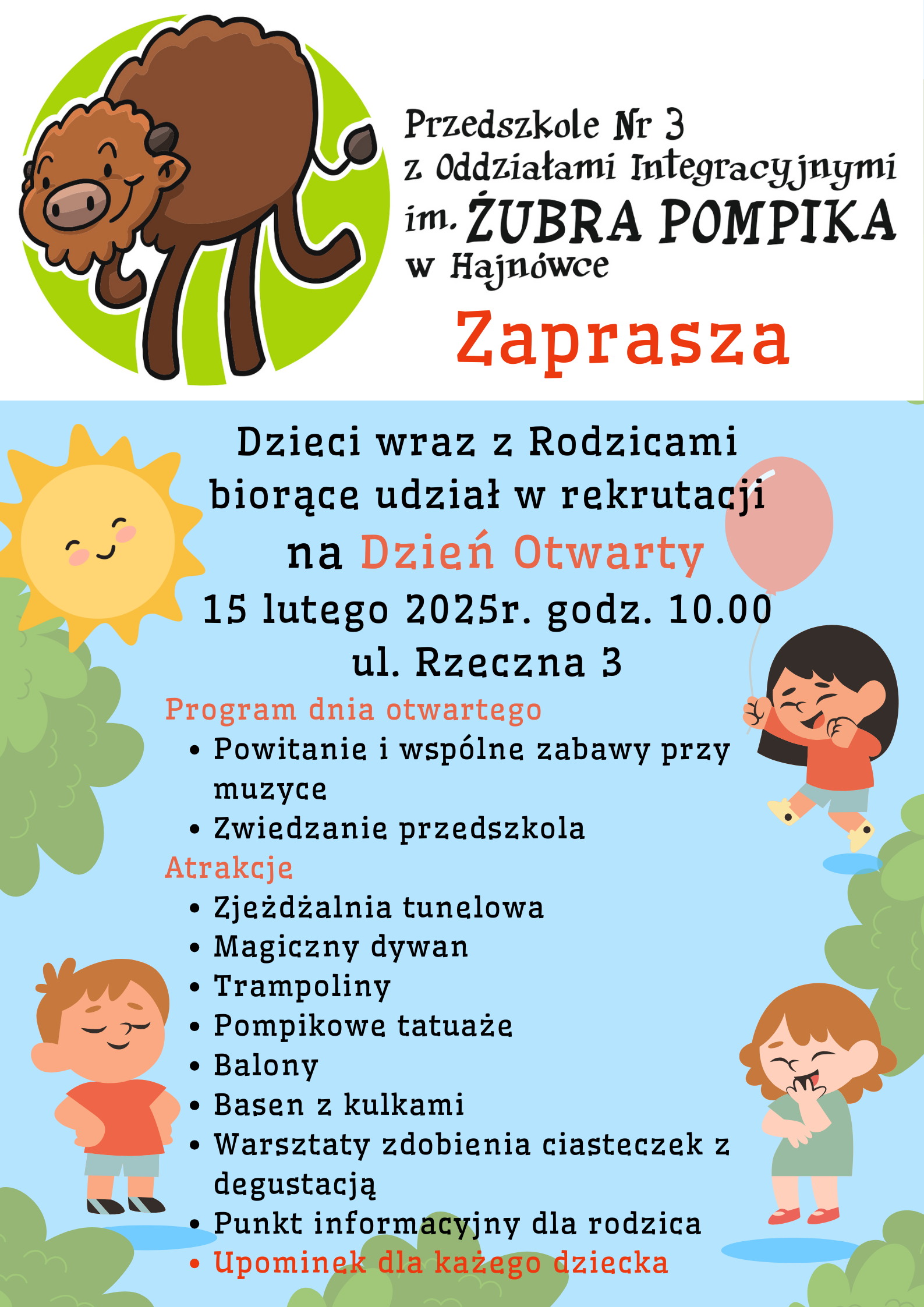 Przedszkole Nr 3 im. Żubra Pompika w Hajnówce zaprasza dzieci wraz z rodzicami na dzień otwarty 15 lutego 2025 r., godz. 10.00, Rzeczna 3
