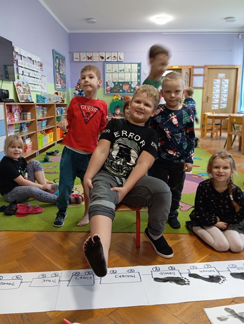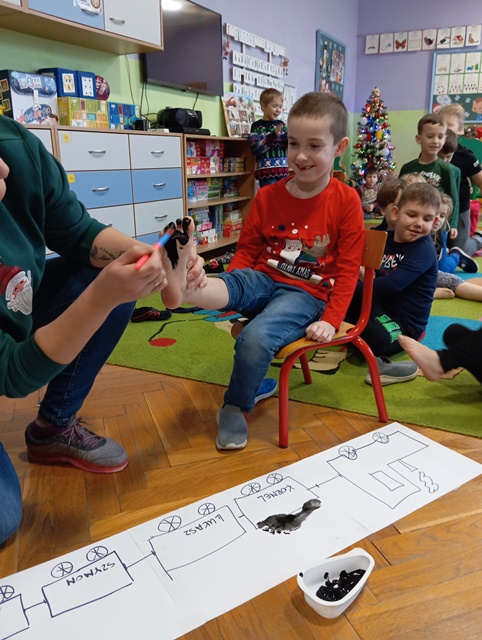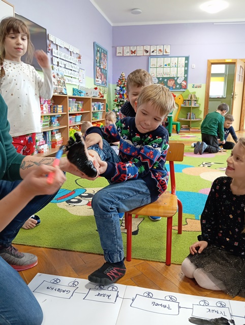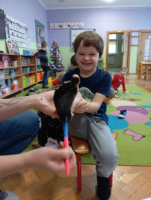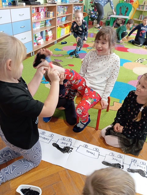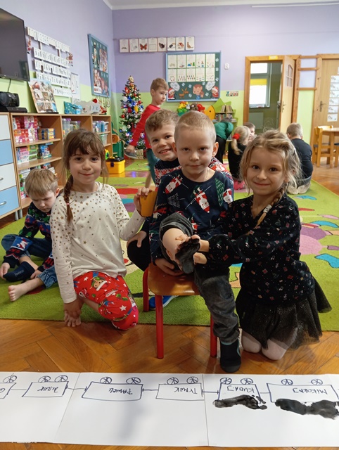 zobrazował wygląd kopalni w części podziemnej, sposób wydobywania węgla kamiennego. Mogliśmy zobaczyć jak ważna i ciężka jest praca górników, zapoznać się z różnymi rodzajami ubioru górników- do pracy pod ziemią i strój odświętny. Wiemy, że „czako” to odświętna czapka górnika. Chcieliśmy zbadać właściwości węgla, tak więc oglądaliśmy bryłkę węgla, wąchaliśmy, sprawdzaliśmy czy brudzi ręce, czy jest ciężki czy lekki. Stworzyliśmy nawet pociąg z wagonikami, który wydobył kilka ładnych stópkowych bryłek węgla, a przy okazji mieliśmy świetną zabawę sensoryczną. Nowym doświadczeniem było rysowanie węglem.