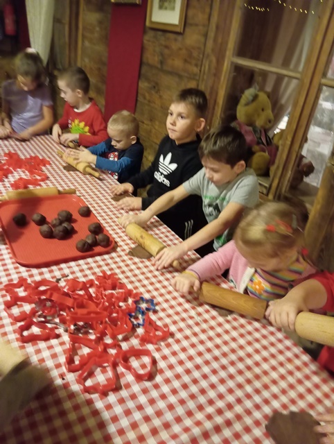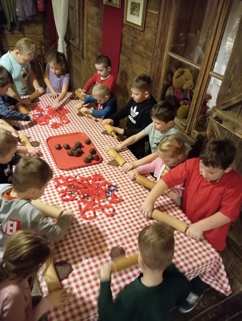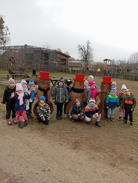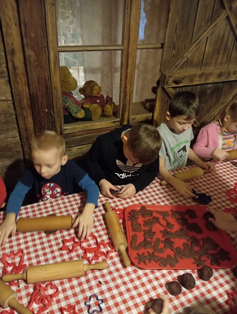 Mikołajkowy czas był pełen wrażeń. Spotkanie i zabawy z meeeega Mikołajem, upominki, oraz wycieczka do magicznej Wioski Świętego Mikołaja w Majątku Howieny. Tam czekały Elfy, które poczęstowały nas pyszną herbatka i ciasteczkami. Następnie wysłuchaliśmy ciekawych opowieści świątecznych oraz rozpoczęliśmy zabawy muzyczno-ruchowe. Kolejną aktywnością było lepienie pierniczków i wizyta Świętego Mikołaja, który wykonał z każdym Jeżykiem pamiątkowe zdjęcie. Nie mogło zabraknąć pisania listów, które wrzuciliśmy do specjalnej skrzyni na Poczcie Świętego Mikołaja. Mieliśmy także okazję zobaczyć Fabrykę prezentów oraz zwierzątka w szopce. Wizyta w Wiosce Świętego Mikołaja przeniosła nas w magiczną atmosferę zbliżających się świąt Bożego Narodzenia i dostarczyła wiele wrażeń.
