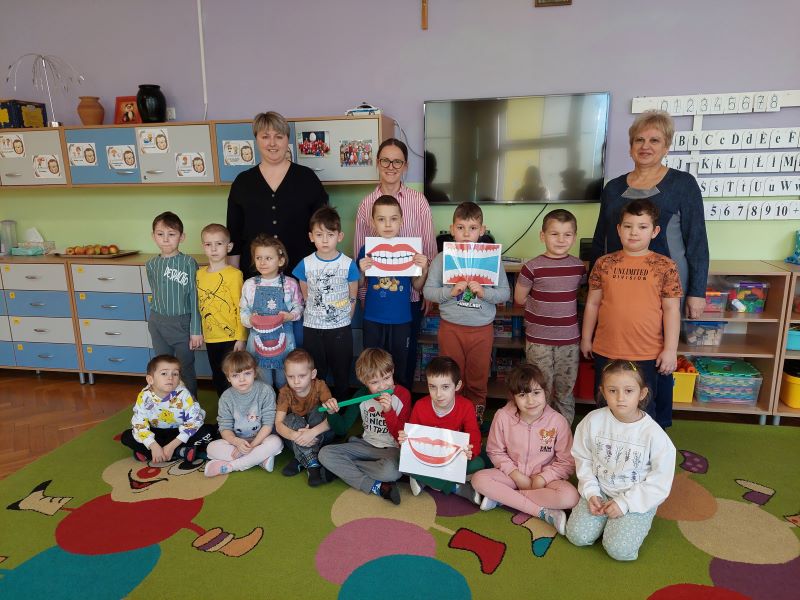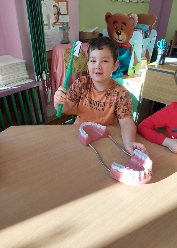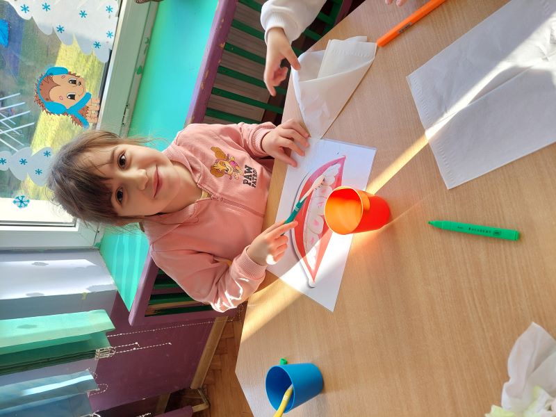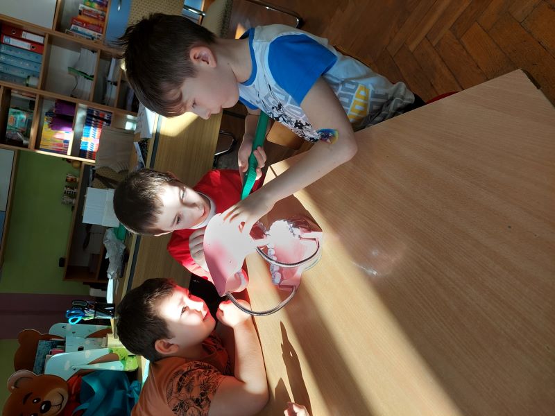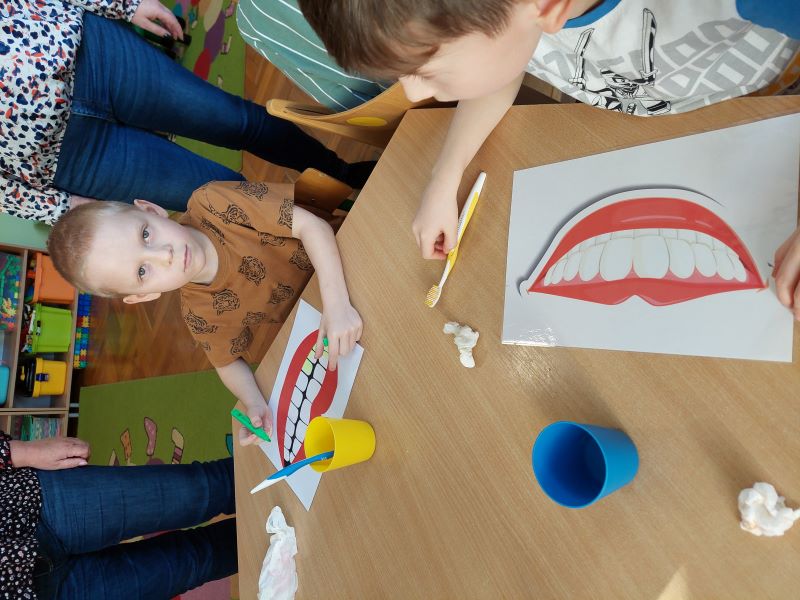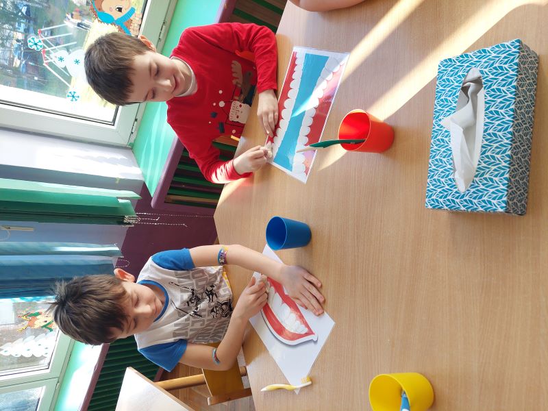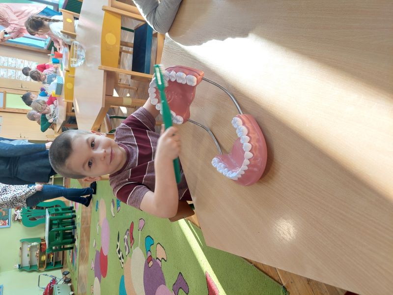 za pomocą szczoteczki do zębów zamoczonej w wodzie, która była symbolem pasty do zębów, dzieci czyściły zęby z namalowanych ubytków, a na koniec ręcznikiem papierowym, który symbolizował płukanie jamy ustnej, usuwały pozostałości mazaków- zarazków)