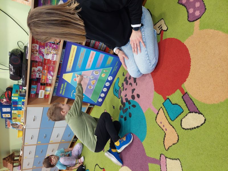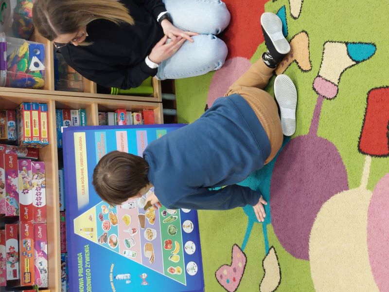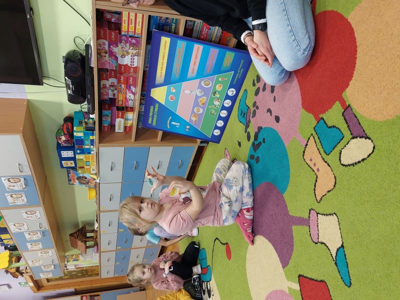 ułożenie magnetycznej piramidy zdrowia wraz z nazwaniem wylosowanych produktów spożywczych,