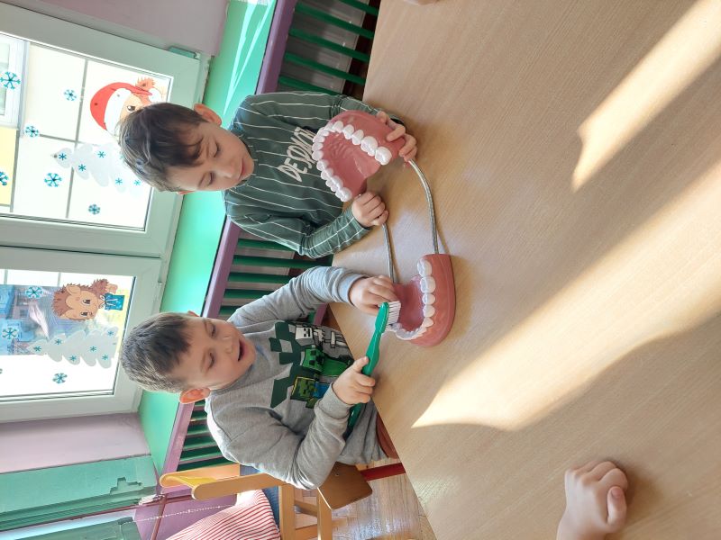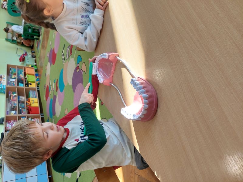 zaprezentowanie przez dzieci, jak codziennie szorować zęby przy użyciu modelu szczęki i szczoteczki do zębów,