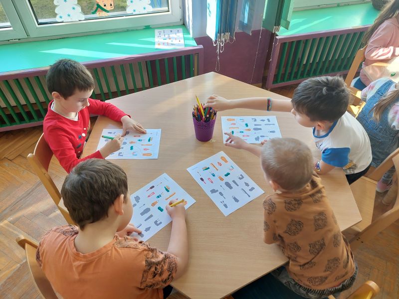 uzupełnianie kart pracy – dopasowanie do przedmiotów służących do higieny ciała odpowiednich cieni,