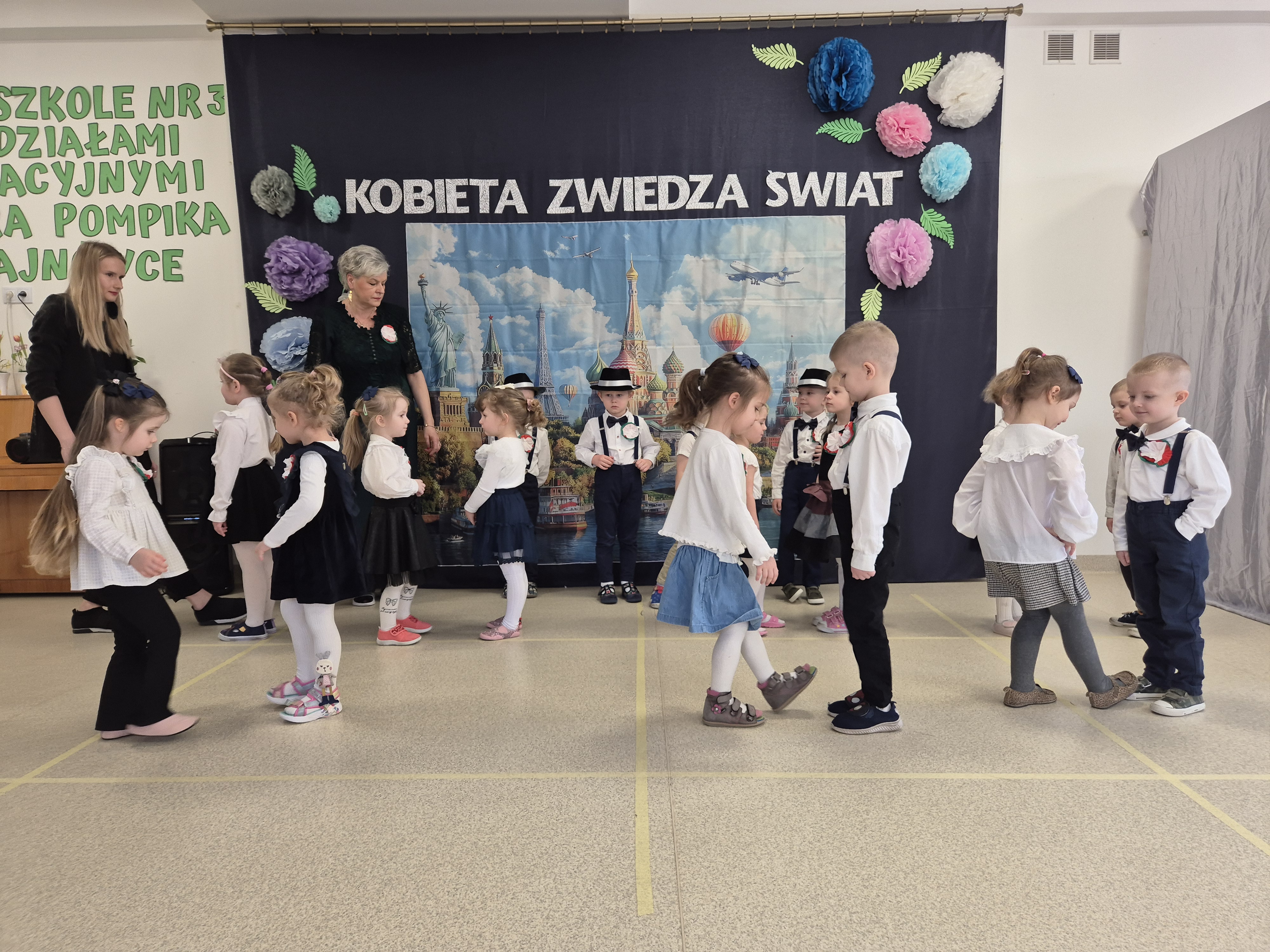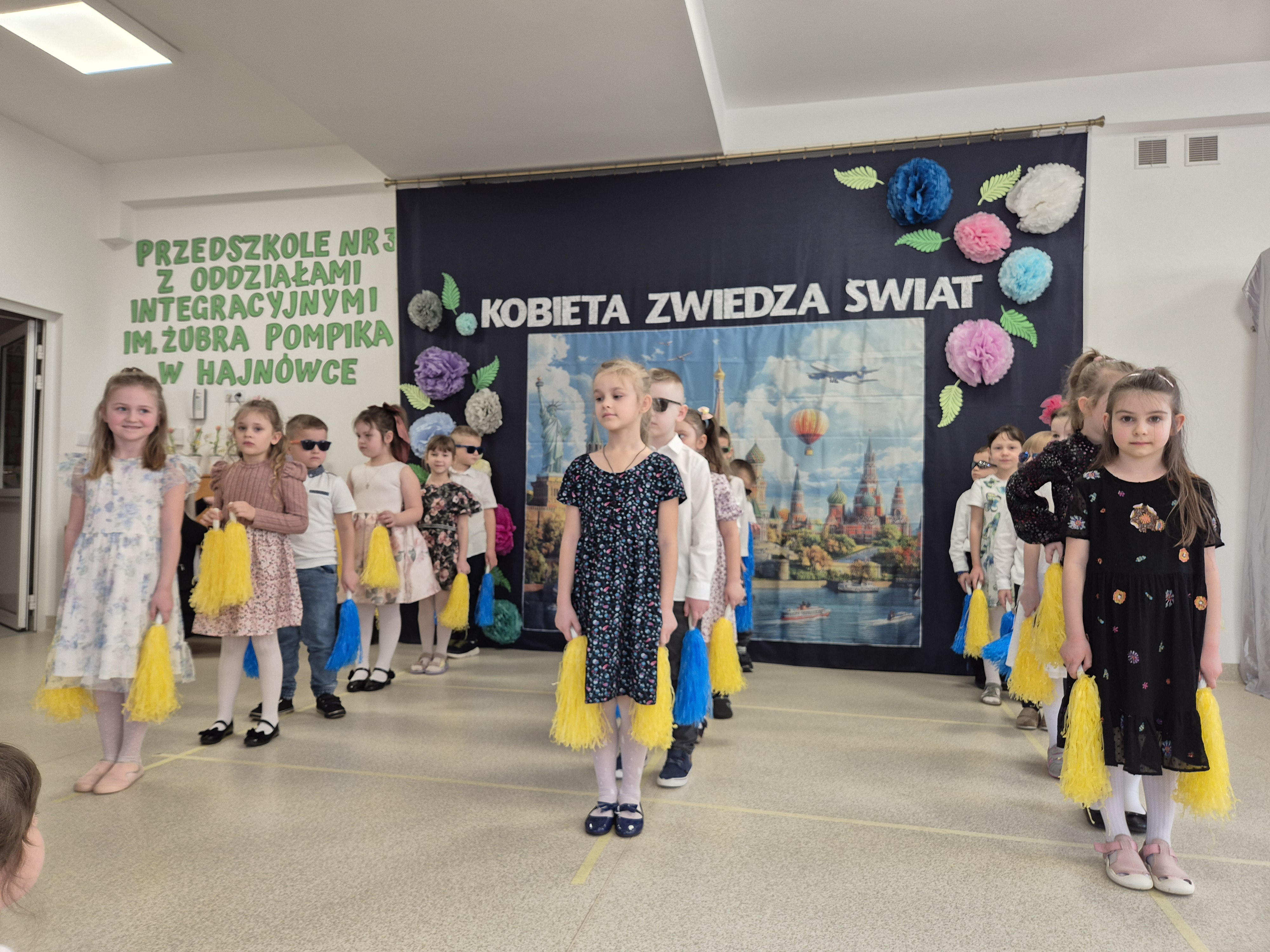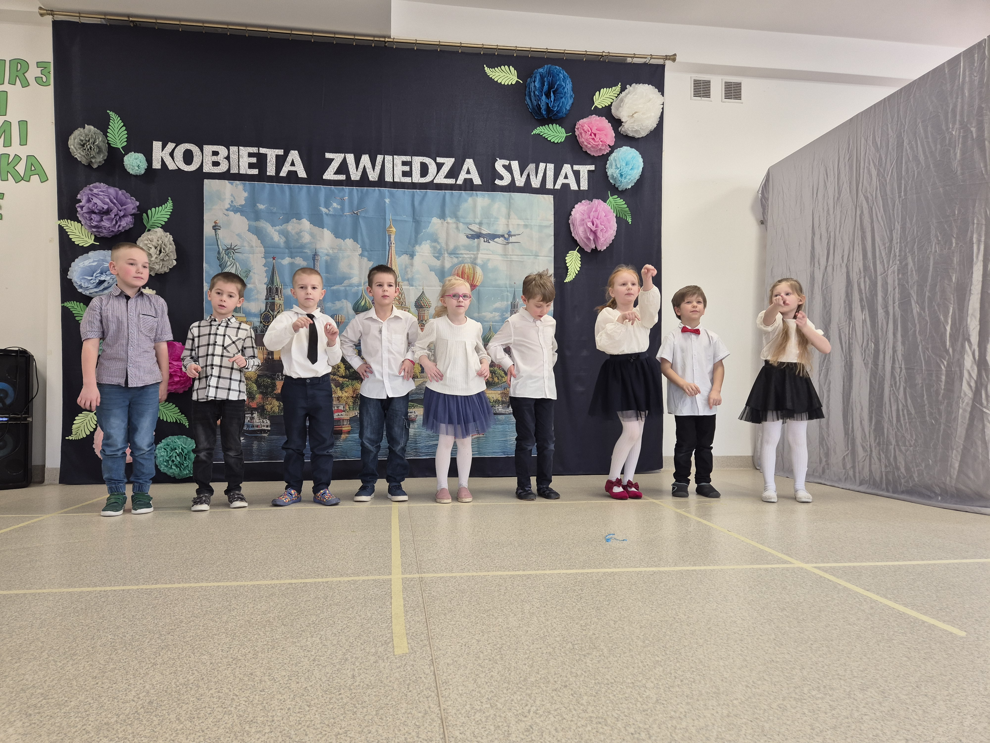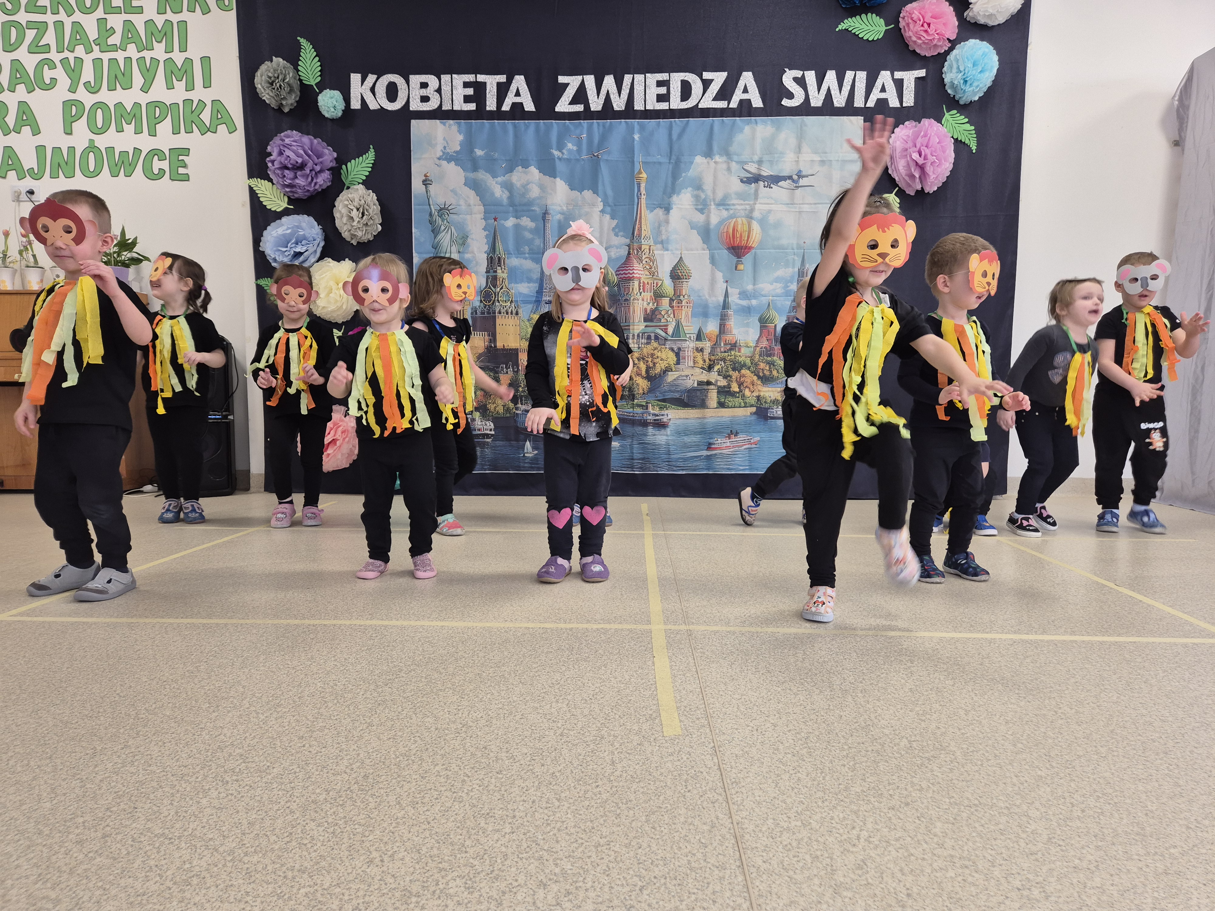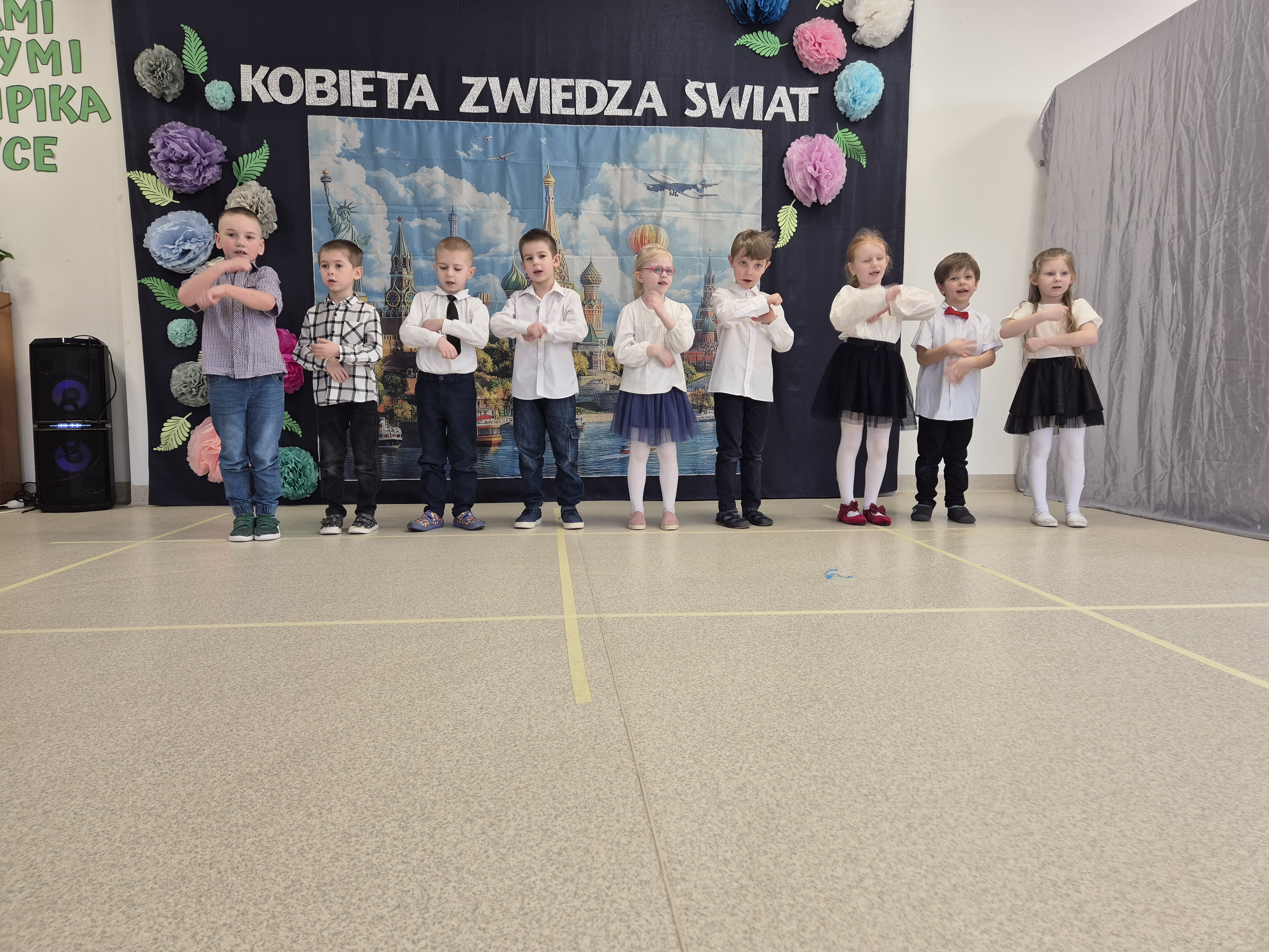 W tym roku podczas obchodów 8 marca w naszym przedszkolu dzieci przygotowały dla wszystkich pracowników placówki program artystyczny, który wspólnie rozpoczęły grupy Lisków i Rysiów „Piosenką o podróżach” zabierając publiczność na niezapomnianą wyprawę po świecie. Odwiedzając poszczególne kraje przedszkolaki ze wszystkich grup zaprezentowały wspaniałe występy w trakcie, których mogliśmy zobaczyć różne tańce, charakterystyczne dla wybranych państw.