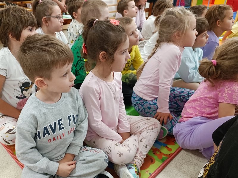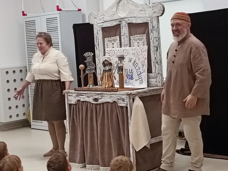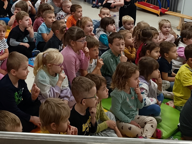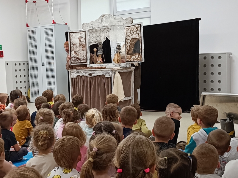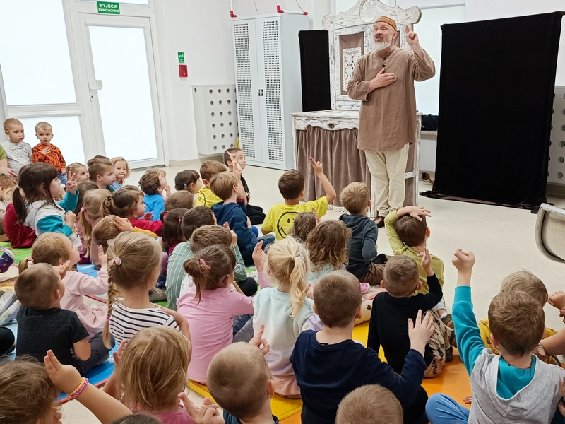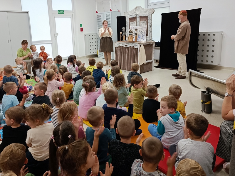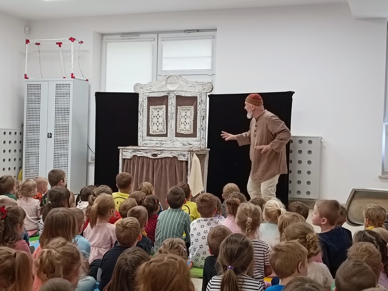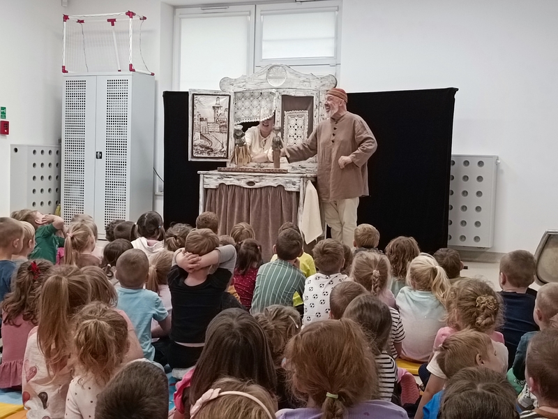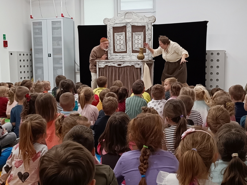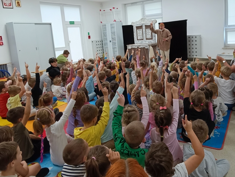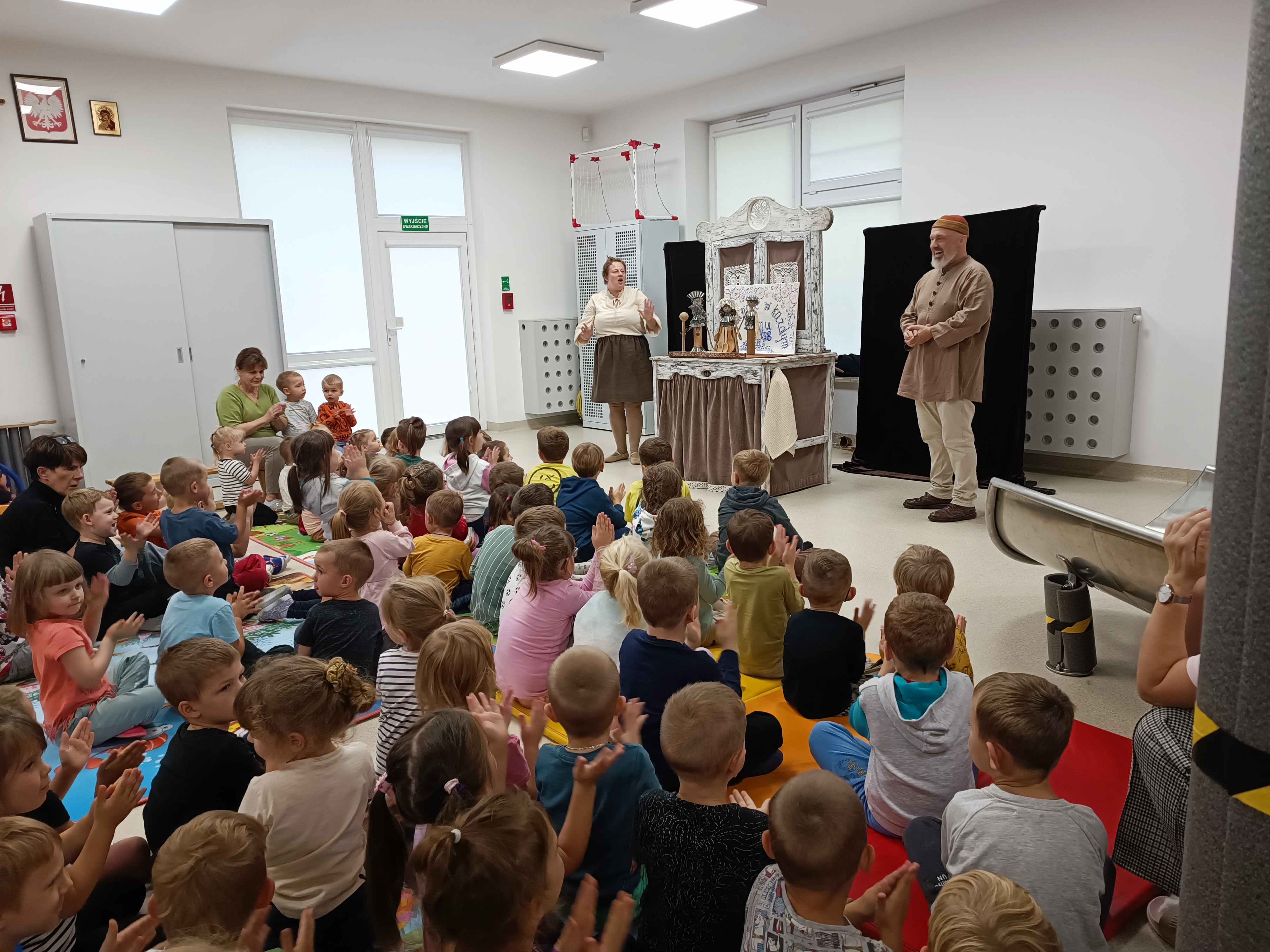 Nasze przedszkole odwiedzili znakomici goście – artyści „Teatru Pod Orzełkiem”, którzy zaprezentowali dzieciom niezwykle ciekawy i pełen humoru spektakl pt. „Opowieści Starego Kredensu”. Już od pierwszych chwil przedstawienia mali widzowie dali się porwać do świata niezwykłych opowieści, w którym zwykłe kuchenne przedmioty ożyły i stały się bohaterami bajek oraz legend. Dzieci aktywnie uczestniczyły w wydarzeniach na scenie – pomagały bohaterom, śpiewały, odpowiadały na pytania aktorów, a nawet złożyły uroczyste „rycerskie ślubowanie grzeczności”, stając się członkami „Zakonu Rycerzy Dobrej Maniery”.