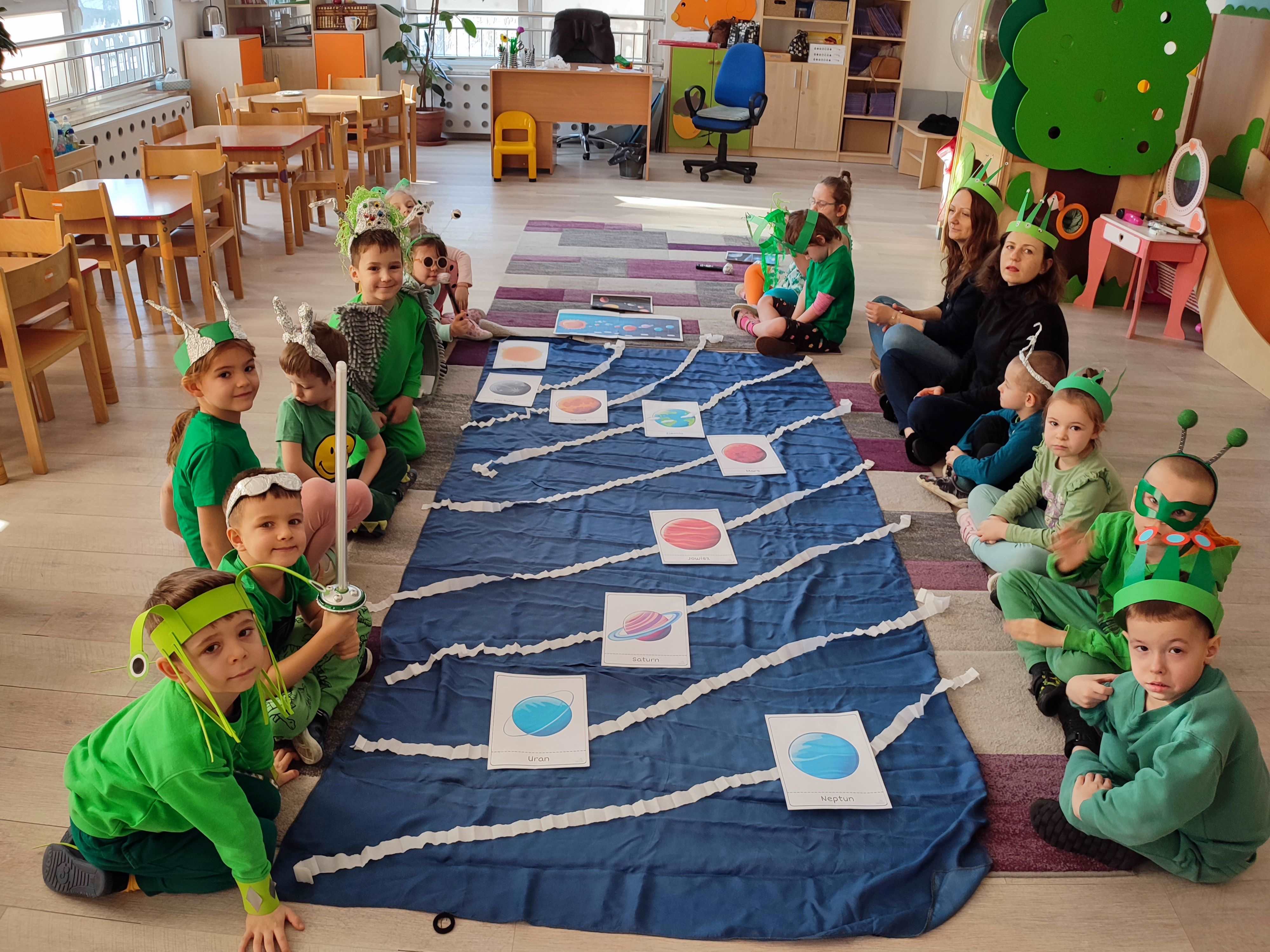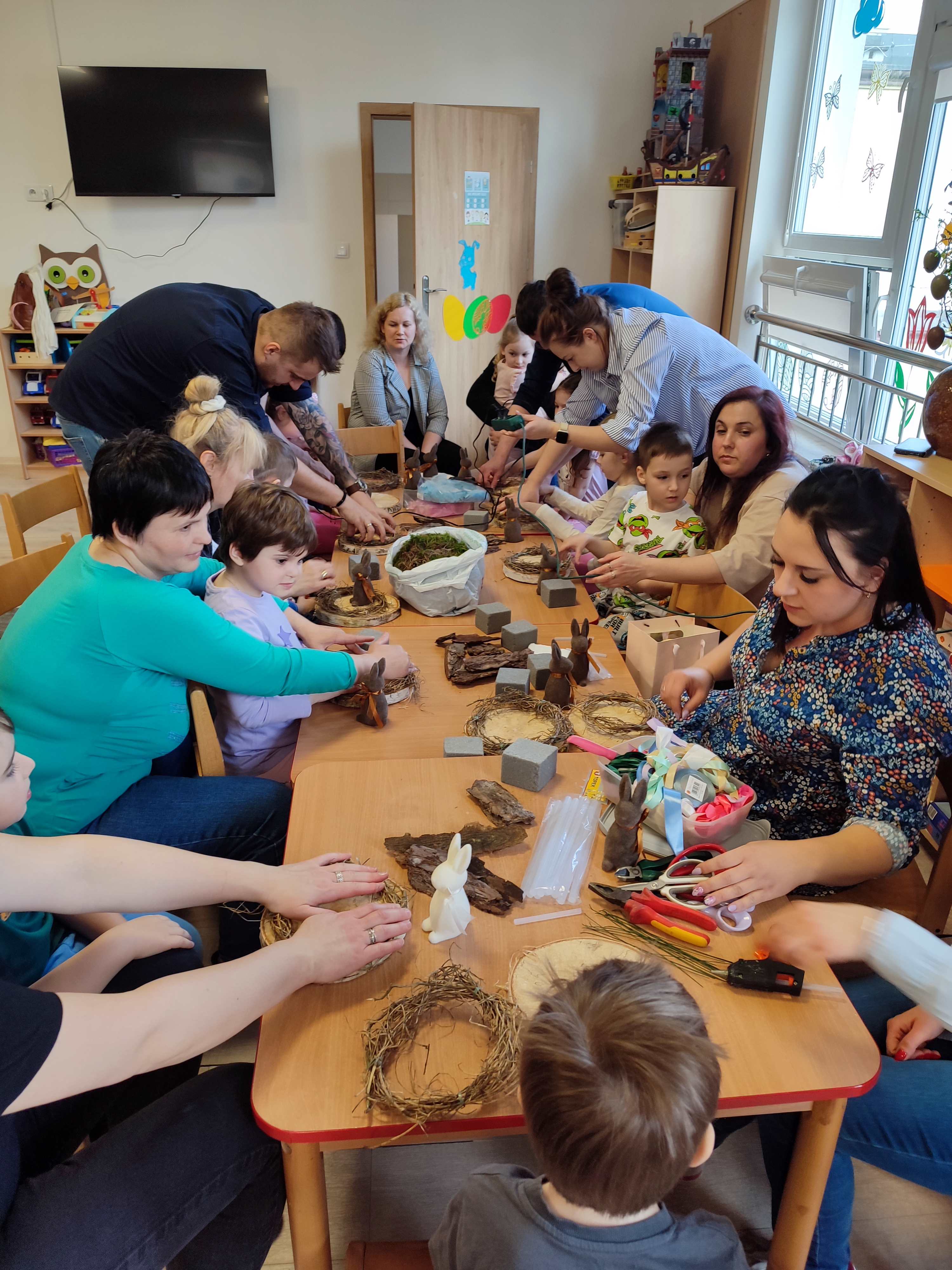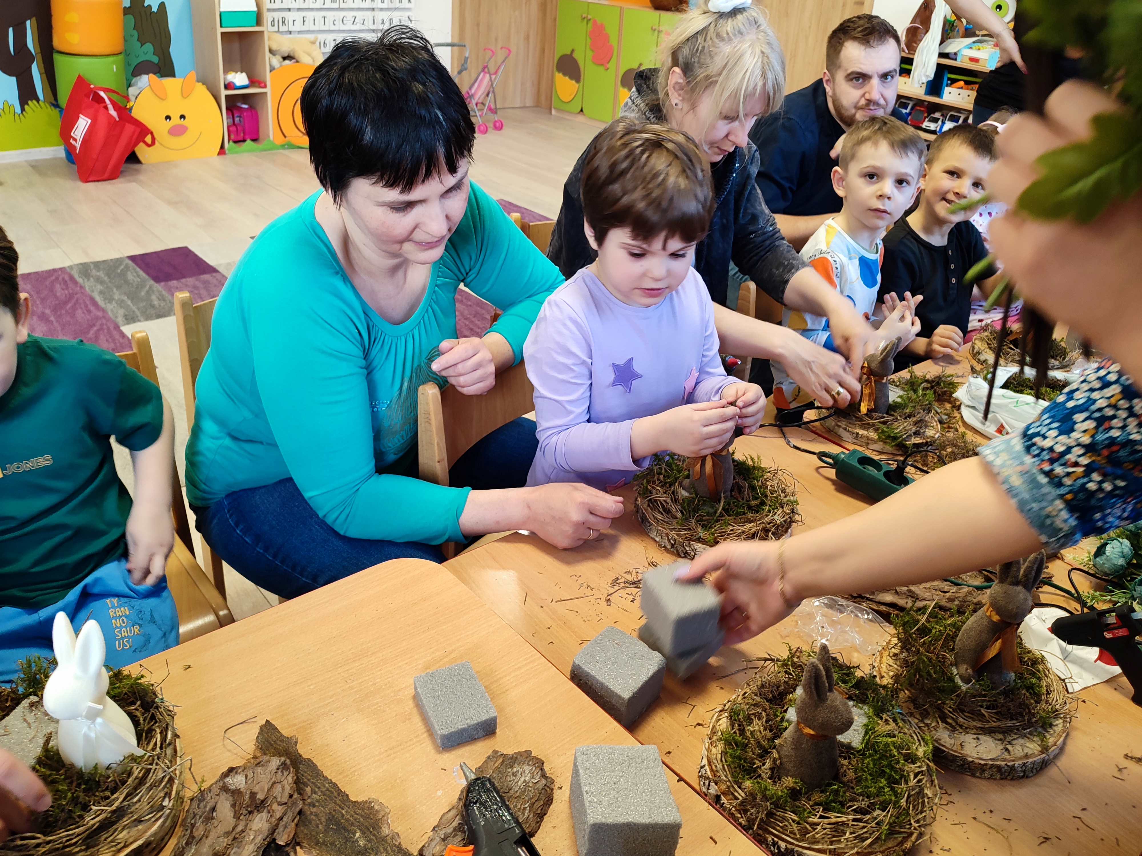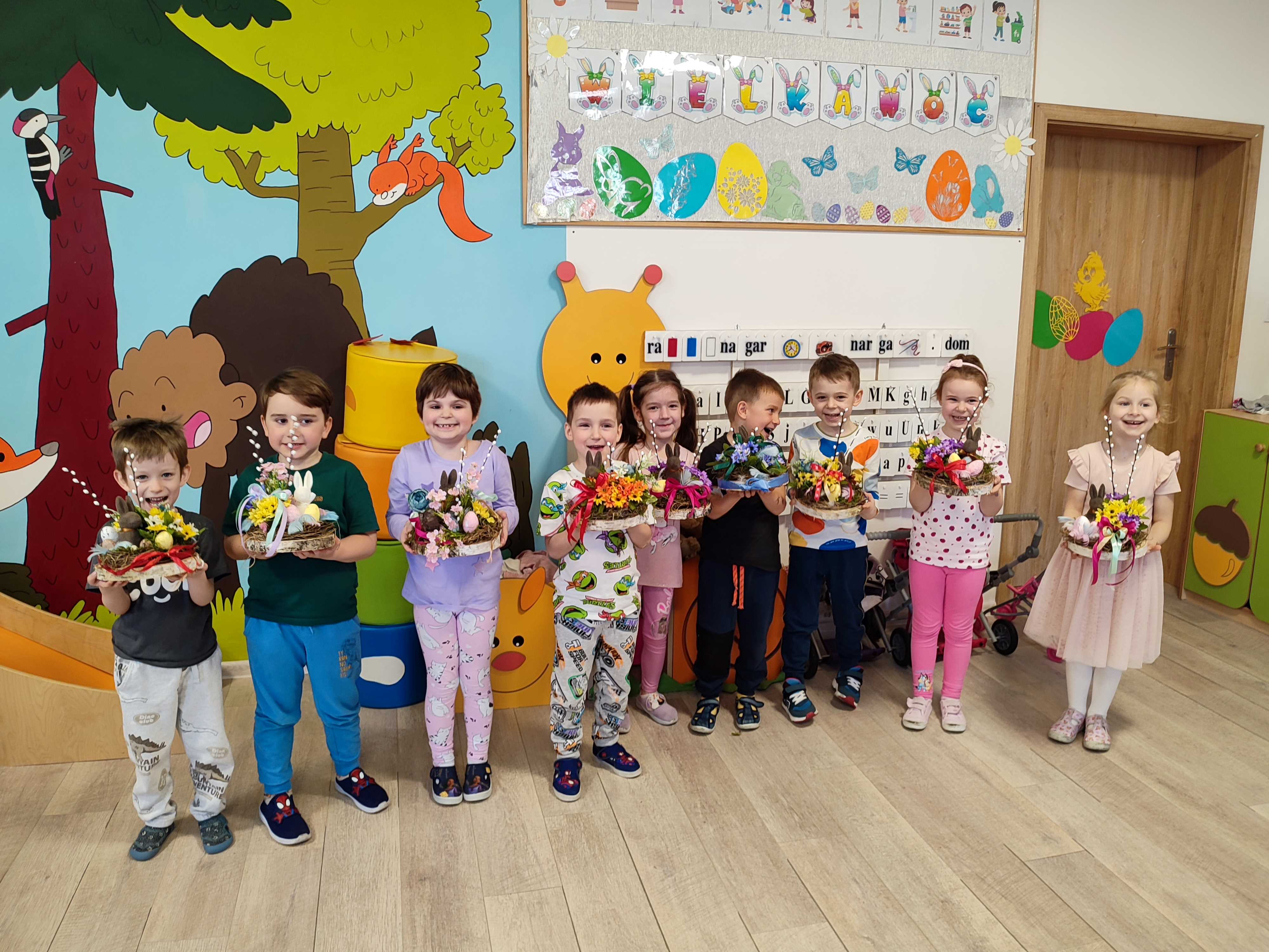 Najpierw dzieci miały wizytę Gości z Poradni Pedagogiczno-Psychologicznej, gdzie opowiedziały nam o trudnościach jakie spotykają na swojej drodze osoby niesłyszące. Potem urządziliśmy wspólne zabawy i tańce. Mieliśmy również możliwość spróbowania swoich sił w ścieżce sensorycznej….oooooj nie lada to był wyczyn, okazało się, że życie kociaka wcale nie jest takie proste jak może się wydawać. Przeżyliśmy również matematyczny dzień w kosmosie. Dzięki pomocy i uprzejmości Rodziców mogliśmy na jeden dzień zmienić się w kosmitów i poznać ich życie, gry i zabawy. Przy okazji wzbogaciliśmy swoją wiedzę o kolejne planety, mogliśmy również stworzyć swoje własne i podziwiać ich modele 3D. Na koniec wykonaliśmy swój własny kosmos w słoiku. Przywitaliśmy również wiosnę w Hajnowskim Domu Kultury na zajęciach dotyczących Wiosny. Bawiliśmy się rewelacyjnie, było mnóstwo zabaw ruchowych przy muzyce. Dzieci wykonały również swoje własne postacie wiosenne. Bawiliśmy się również w ogrodnika i wysialiśmy owies. Obserwowaliśmy codziennie jak kiełkują roślinki i jak szybko rosną. Okazało się, że mamy w grupie samych wspaniałych ogrodników. Odbyły się również warsztaty Wielkanocne na których rodzice wraz z pociechami robili stroiki świąteczne. Efekty pracy przerosły nasze najśmielsze oczekiwania. Stroiki wyszły przepiękne i z pewnością ozdobiły stoły w domach.