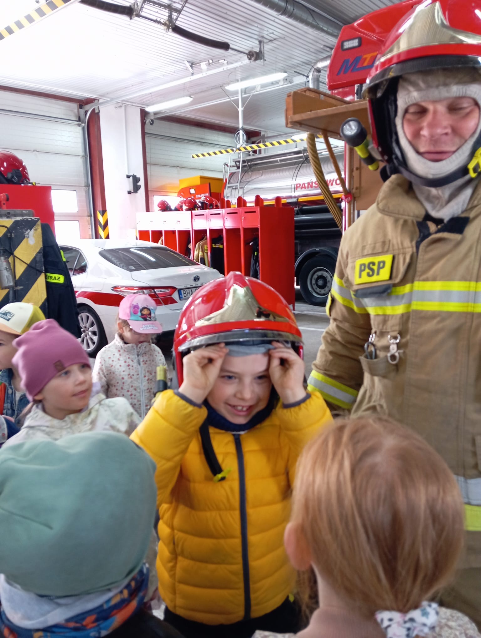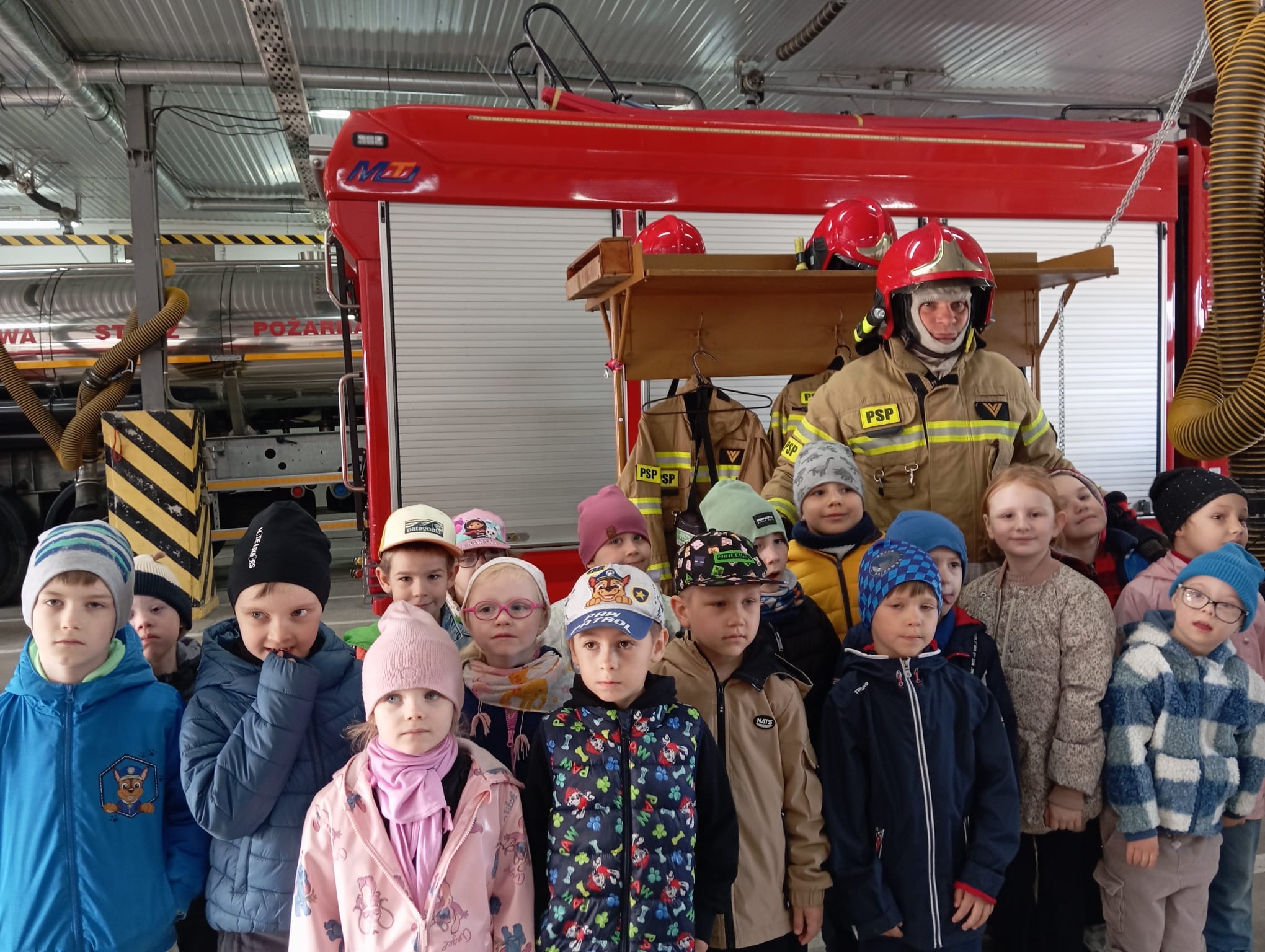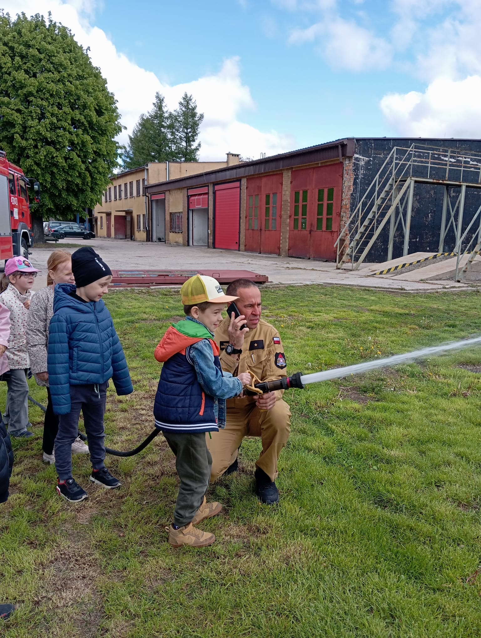 15 maja 2025r. grupa Żuberków udała się na wycieczkę do Powiatowej Straży Pożarnej. Przed remizą czekali na nas strażacy i przywitali nas z życzliwością i uśmiechem. Najpierw mogliśmy z bliska obejrzeć samochody i sprzęt pożarniczy. W trakcie rozmowy dzieci dowiedziały się jak trudna i odpowiedzialna jest praca strażaka. Zrozumiały, że strażak pomaga nie tylko w trakcie pożaru, ale bierze udział w akcjach ratowniczych np. podczas wypadków drogowych i klęsk żywiołowych. Przedszkolaki z zaciekawieniem oglądały węże, prądownice i inne elementy wyposażenia wozu strażackiego oraz strój strażacki. Mogły też sprawdzić jak daleko tryska woda z węża strażackiego. Następnie ćwiczyły umiejętność udzielania pierwszej pomocy i uczyły się jak można wezwać straż pożarną w razie potrzeby. Przedszkolaki wykazały zainteresowanie spotkaniem i nabyły cenną wiedzę.