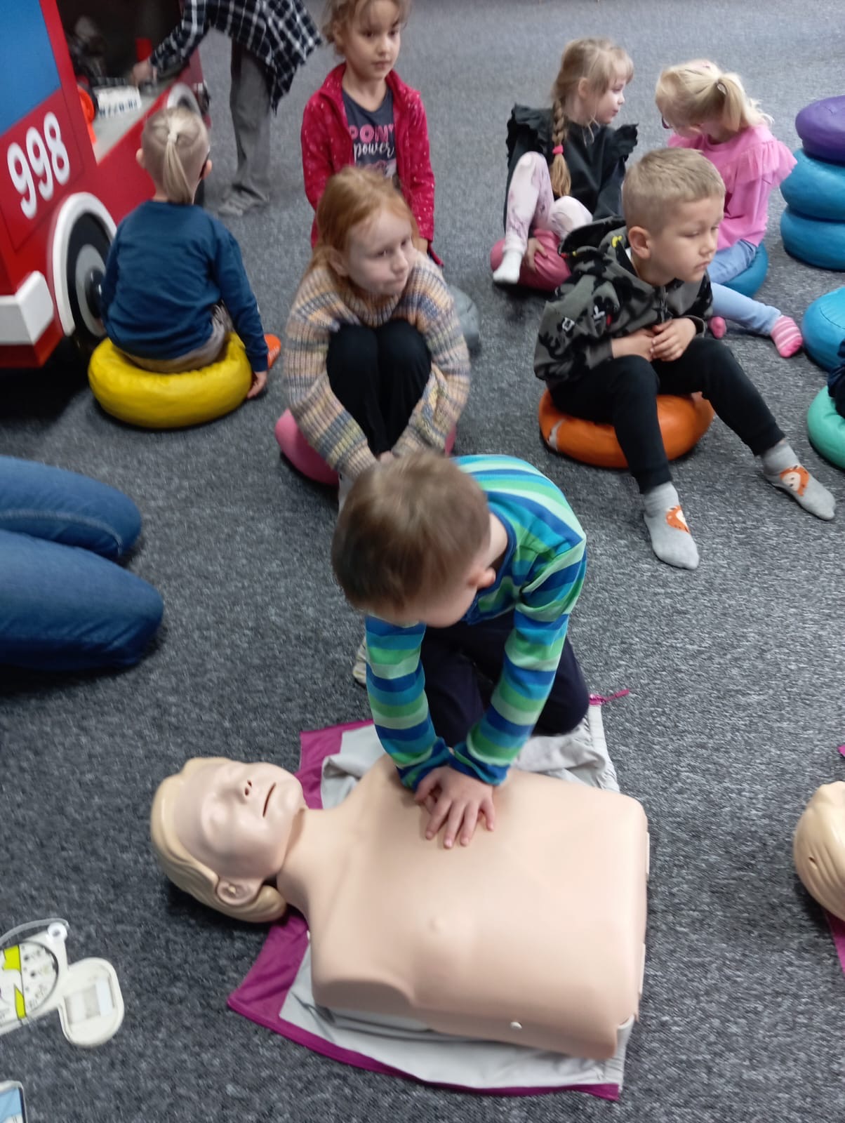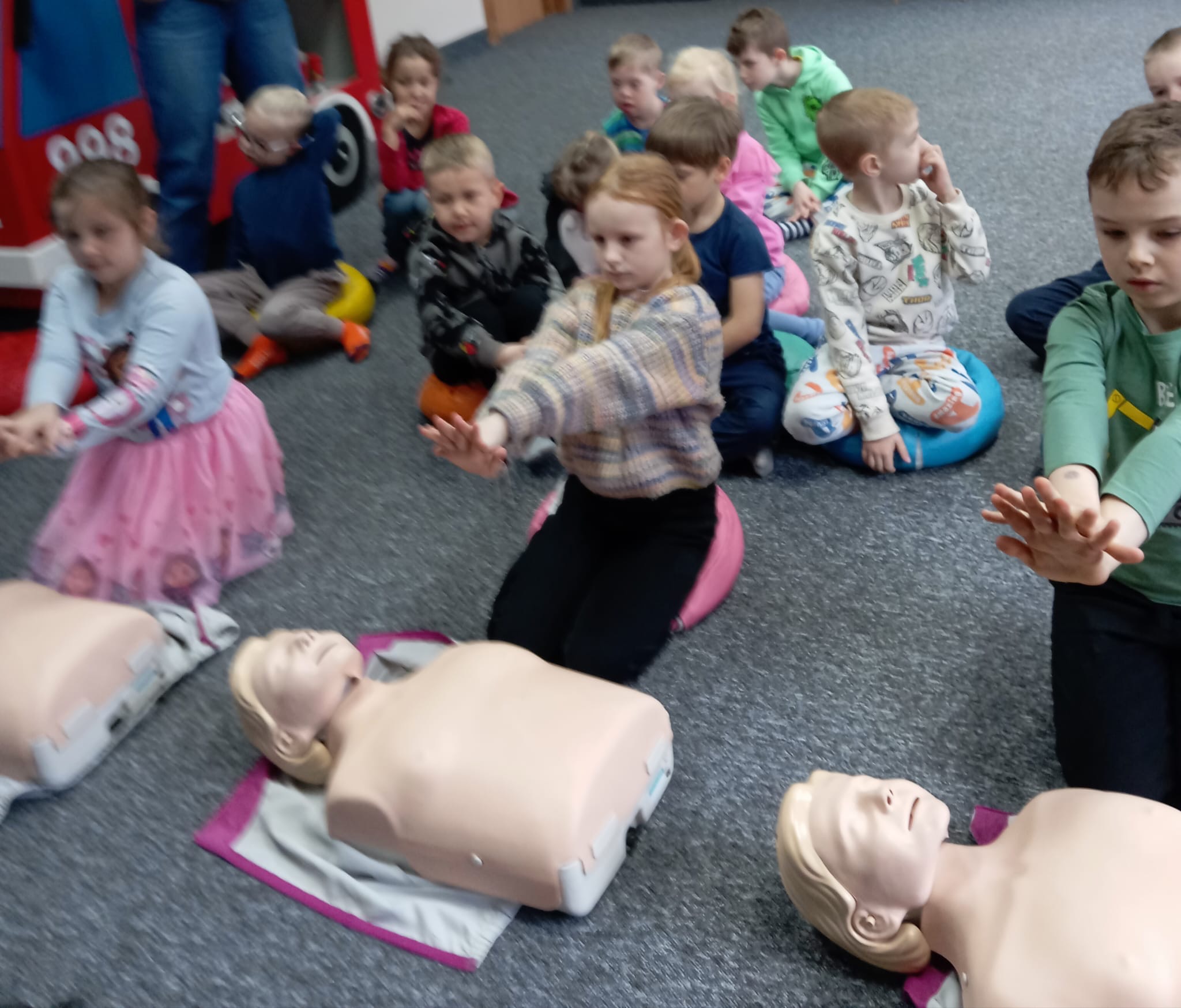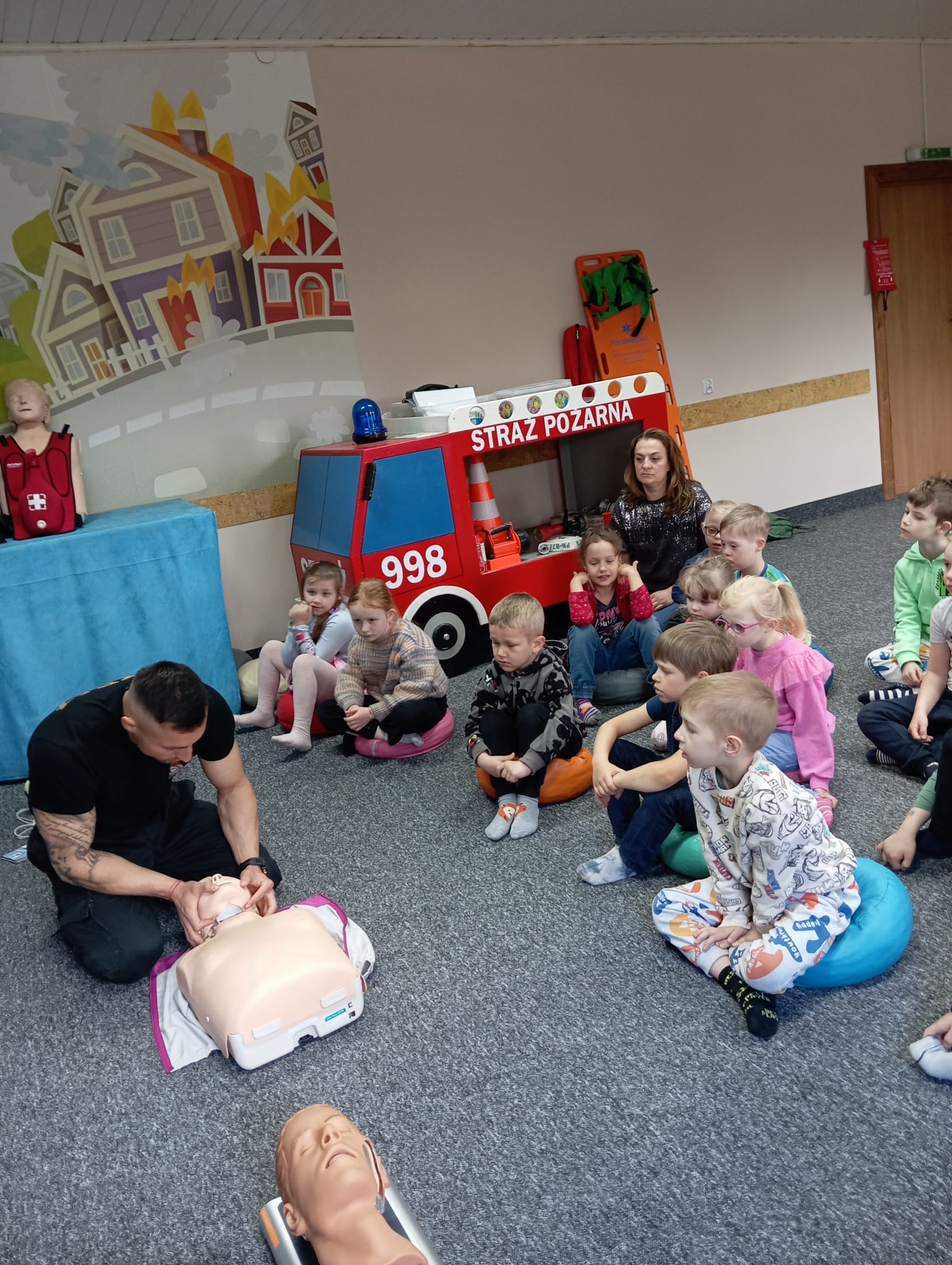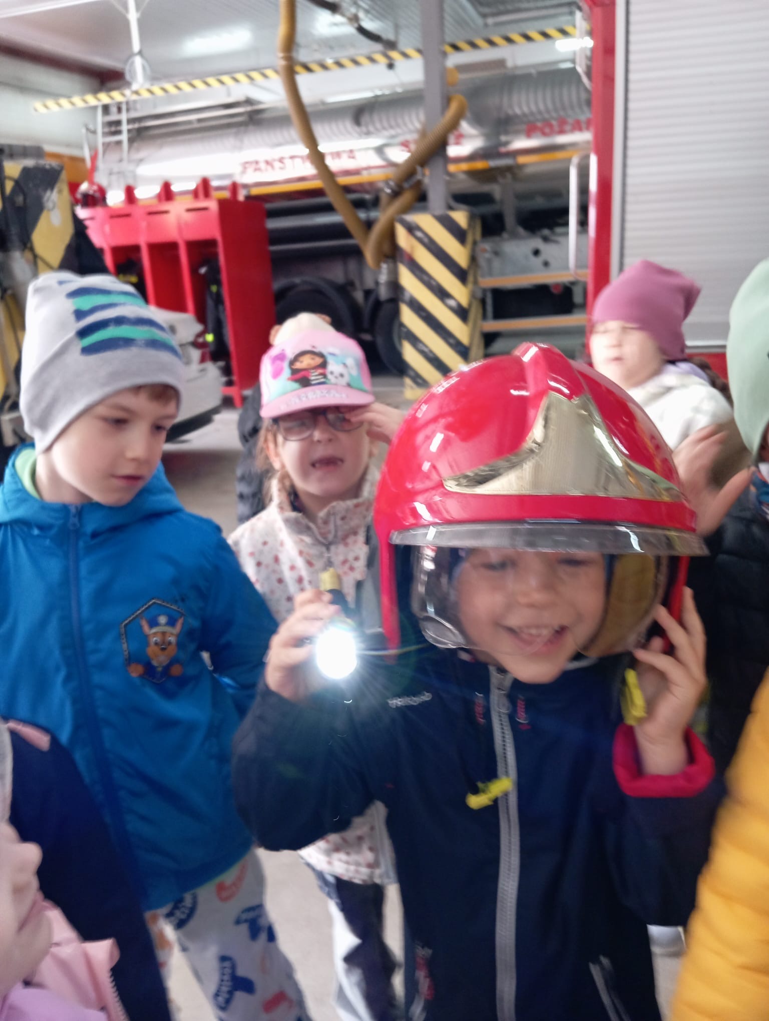 15 maja 2025r. grupa Żuberków udała się na wycieczkę do Powiatowej Straży Pożarnej. Przed remizą czekali na nas strażacy i przywitali nas z życzliwością i uśmiechem. Najpierw mogliśmy z bliska obejrzeć samochody i sprzęt pożarniczy. W trakcie rozmowy dzieci dowiedziały się jak trudna i odpowiedzialna jest praca strażaka. Zrozumiały, że strażak pomaga nie tylko w trakcie pożaru, ale bierze udział w akcjach ratowniczych np. podczas wypadków drogowych i klęsk żywiołowych. Przedszkolaki z zaciekawieniem oglądały węże, prądownice i inne elementy wyposażenia wozu strażackiego oraz strój strażacki. Mogły też sprawdzić jak daleko tryska woda z węża strażackiego. Następnie ćwiczyły umiejętność udzielania pierwszej pomocy i uczyły się jak można wezwać straż pożarną w razie potrzeby. Przedszkolaki wykazały zainteresowanie spotkaniem i nabyły cenną wiedzę.