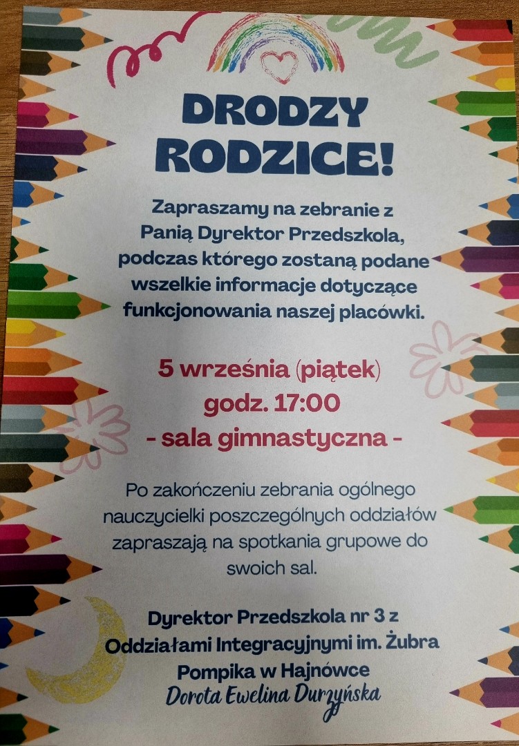 Drodzy rodzice! Zapraszamy na zebranie z Panią Dyrektor Przedszkola, podczas którego zostaną podane wszelkie informacje dotyczące funkcjonowania placówki.